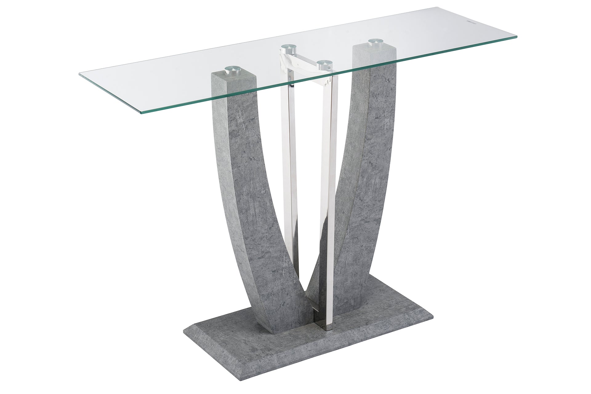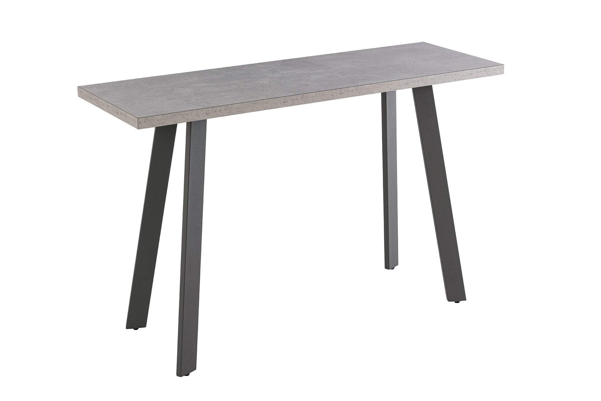 Industrial design dining collection with ‘cement look’ melamine finish on a grey power coated frame with a stunning set of dining chairs.
